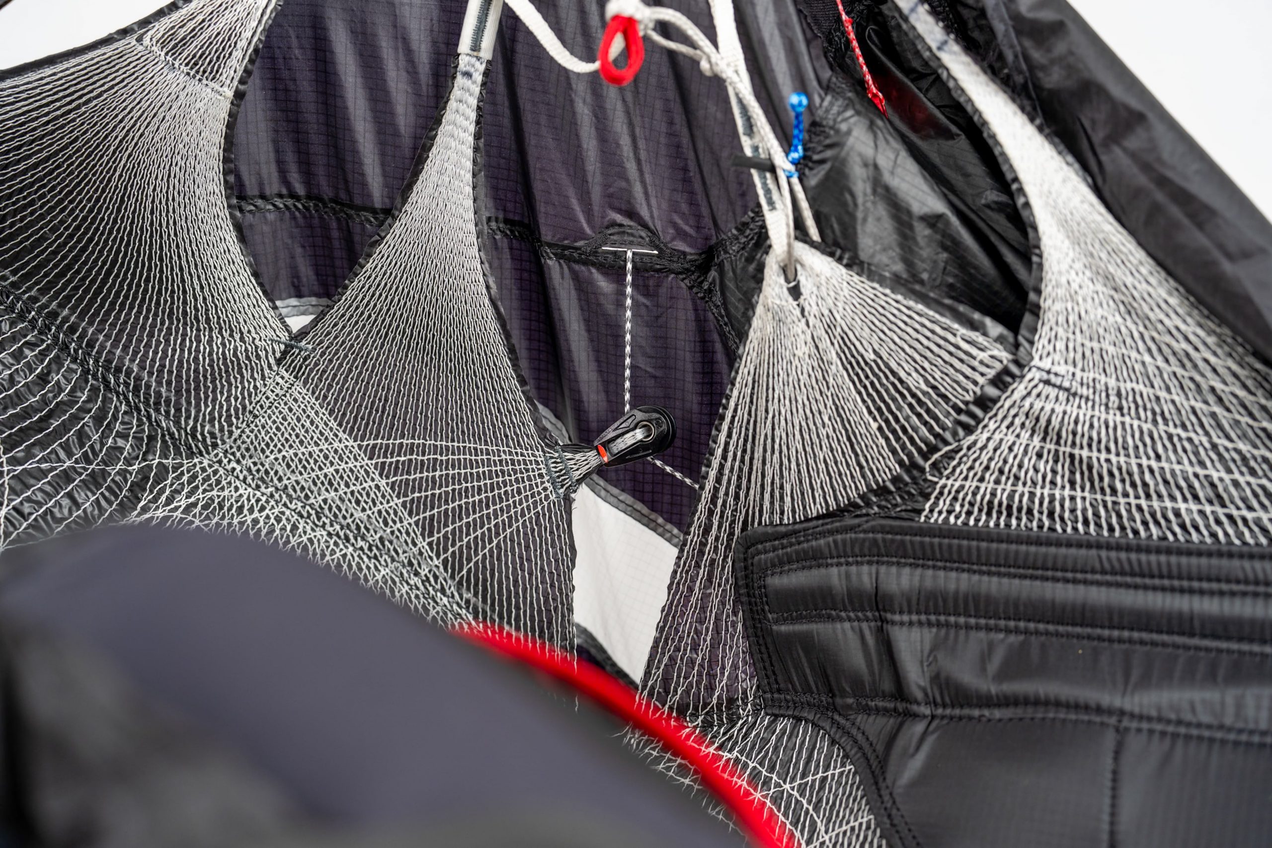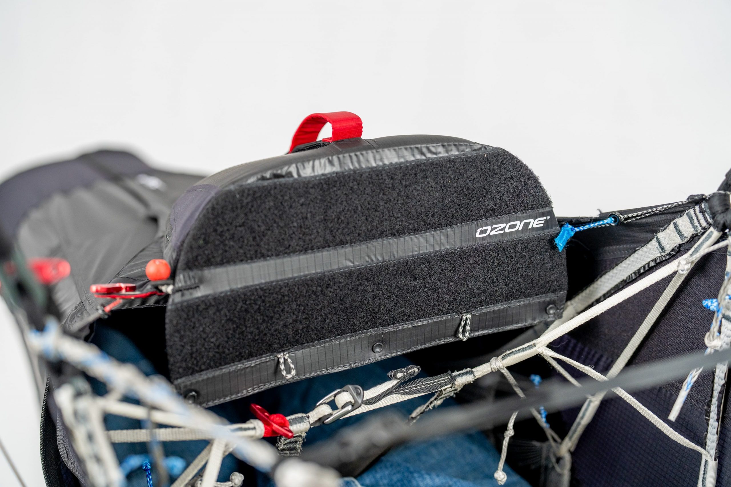 Il y a des poches accessibles en vol de chaque côté du cocon pour un appareil photo ou d’autres équipements. La grande poche arrière de rangement a une manche dans laquelle on peut glisser une outre et un compartiment pour les bâtons de marche, en plus du grand compartiment situé sous l’assise. On peut facilement mettre ses batteries dans la poche du cockpit. Le cockpit amovible est idéal pour les instruments volumineux, il peut être connecté à une poche ventrale si on veut avoir plus de volume accessible en vol.